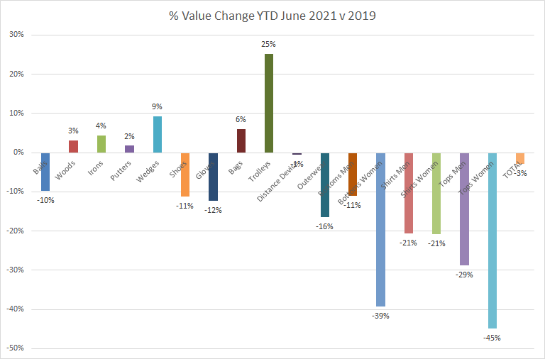 While the totals looked bad, (the market was down 47% year to date by the end of March), the potential impact on the year was far less severe than when we locked down in April and May 2020. This is clearly illustrated by the current numbers. As of the end of June the total sales value for the UK golf market was up 72% YTD on 2020. That’s a big jump.