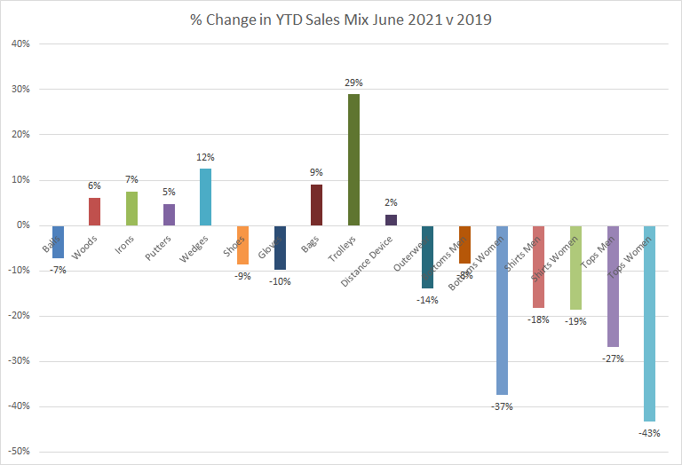 In general, Off-course stores are leading the race for sales growth, with much of this supported by online channels. In fact, Off-course is up 8% in value, year to date, versus 2019, whereas On-course is down a similar amount. Part of that difference is accounted for by changes in the sales mix. On-course is hit hardest when apparel drops which is down around 30% versus 2019.