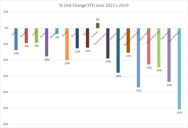 Unit sales tell us how many transactions are going on and there are several reasons for change. We know shops were closed for the first quarter so perhaps we should give them time to catch up. However, there are other factors at play. While the decrease might be the result of a fall in sales, there could also be a leak out of the On and Off-course retail channel to the likes of Amazon and Sports Direct. Unfortunately I don’t have any data for these organisations so I can’t provide numbers here. With Amazon’s growth, they have inevitably done well in golf over the last year or two. What would be interesting is to understand if the growth they have seen has come from traditional golfers switching channels, or from new and returning golfers who don’t have a favourite golf retailer yet. I’m sure there are many new golfers that have been a bit intimidated by the pro shop, or large golf shop, and have preferred to surf reviews and buy online. Moving forward, they represent a great opportunity for the traditional retailer. If speciality golf retailers can engage with these new customers they can offer both price, choice and expert advice. Something that the out-of-channel retailers cannot do.