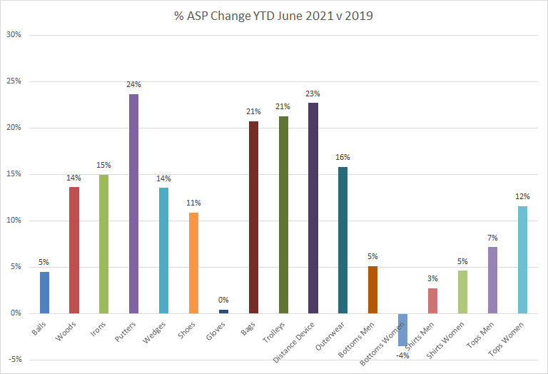 Correct. Price increases tell us one of 2 things: that customers are either happy to pay more for the same item than they would have paid in the past, or that they could be choosing to purchase more expensive items. The following chart shows the change in ASP between 2019 and 2021. With the odd exceptions, prices are up a good deal compared to 2 years ago with Putters and Distance devices leading the way, at 23%+ increases.