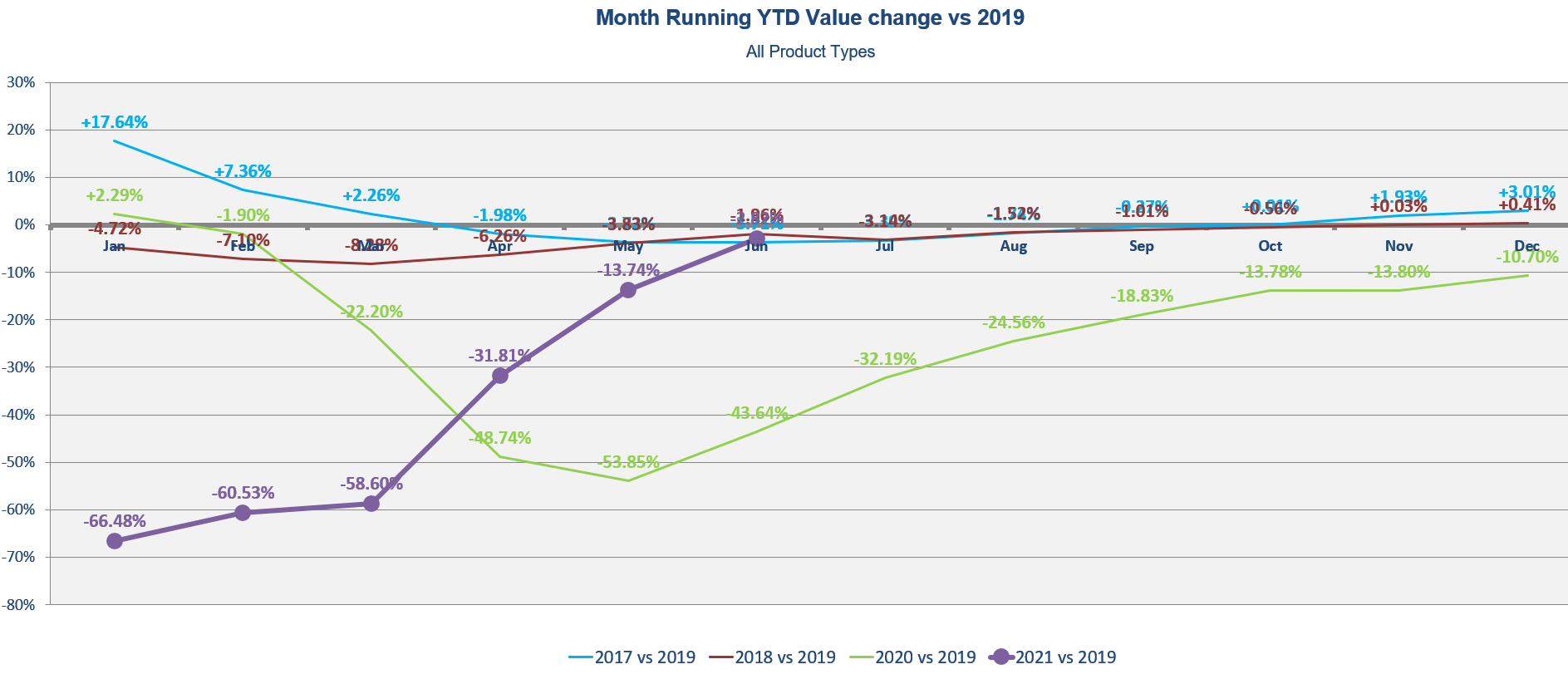 However, we need to remember that percentage changes can be misleading. If we compare both 2020 and 2021 to 2019, things look very different. Compared to 2019, 2021 is still down in total value sales, year to date – but only by 2.8%. In comparison, 2020 was down 42% at the same time. So things are much healthier this year but we are still only getting back to 2019 levels.