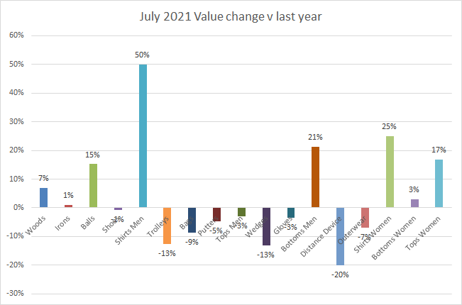 A number of categories were down, including trolleys and distance devices. These have both been hot categories and shown strong in previous months. It’s now a question of whether the demand for these products has been satisfied, or is stock effecting sales? Certainly for trolleys, stock might be an issue. While the off course has increased stock holding on the last 2 years, the on course retailers seem to have a lot less – nearly 50% down in units on 2019.
